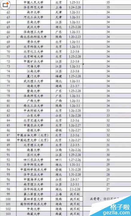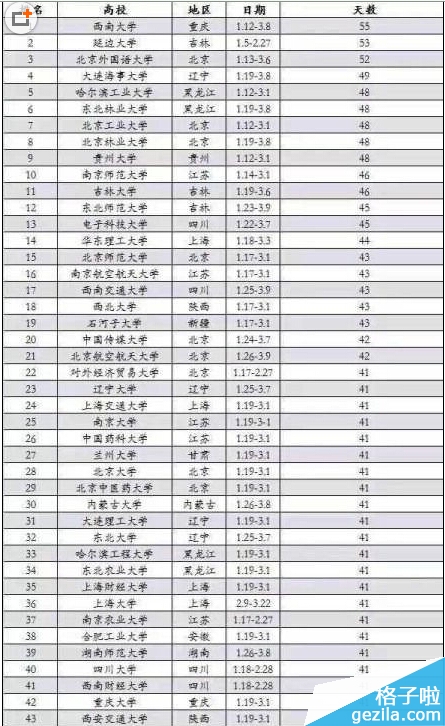 因2015年春节时间较晚,中国各地大学生将迎来38年来超长的一次寒假。近日,厦门、南京等地纷纷晒出高校寒假排行榜,“超长假期”成为网络热门话题。而北京35所高校寒假天数排行榜也在网上流传,根据榜单,中央戏剧学院位居榜首,假期长达60天。再让我们一起来看看2015年各大高校寒假放假时间表吧!