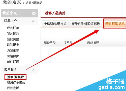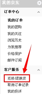 5、寄送之后会有快递单号的, 需要把快递单号填写, 登录京东的我的订单, 然后在左侧导航里面点击“返修/退换货”!
