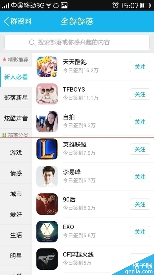 4、点击进入到兴趣部落的页面上,然后根据分类有很多的部落,你选择你喜欢的部落。