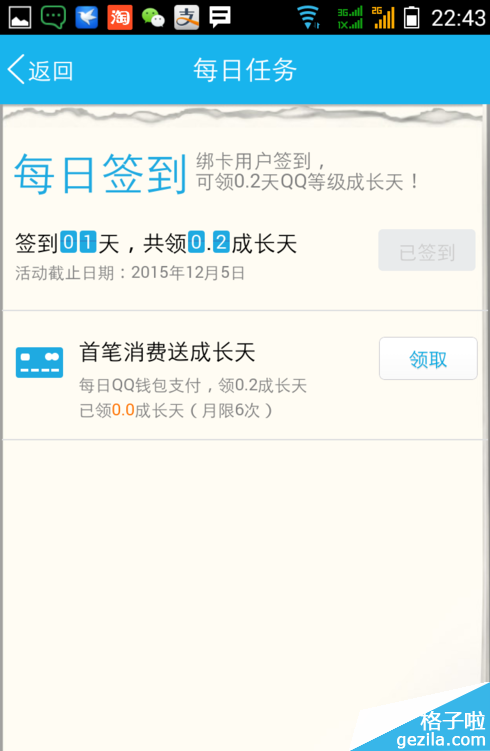 3、在每日任何里即可进行每日签到,签到即可领取0.2天QQ等级成长天小伙伴们造吗!