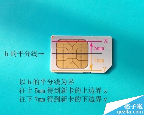 b的一半是6mm,画一条垂直于b的平分线,然后以该平分线为界,往上找5mm,画一条平行于长边的线x,往下找7mm,画一条平行于长边的线y,这两条线就是新卡的两个边。