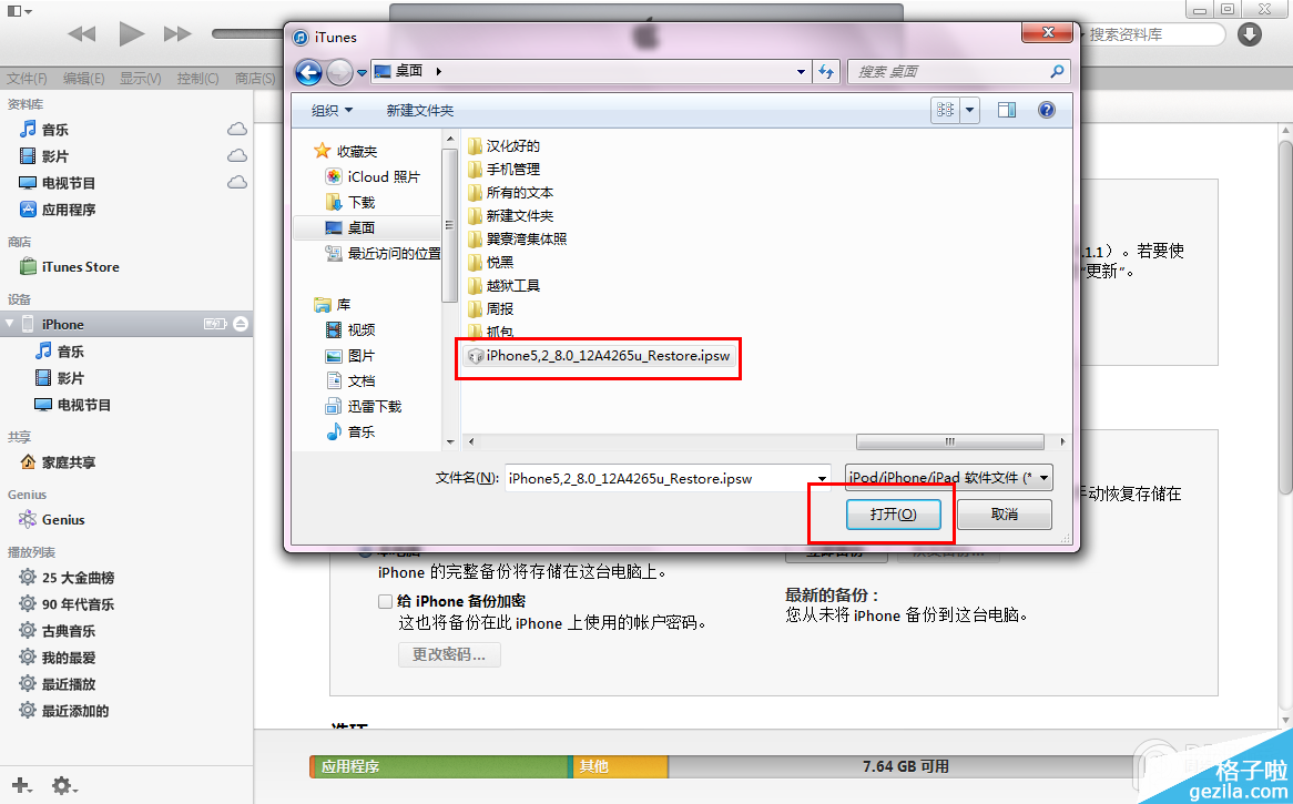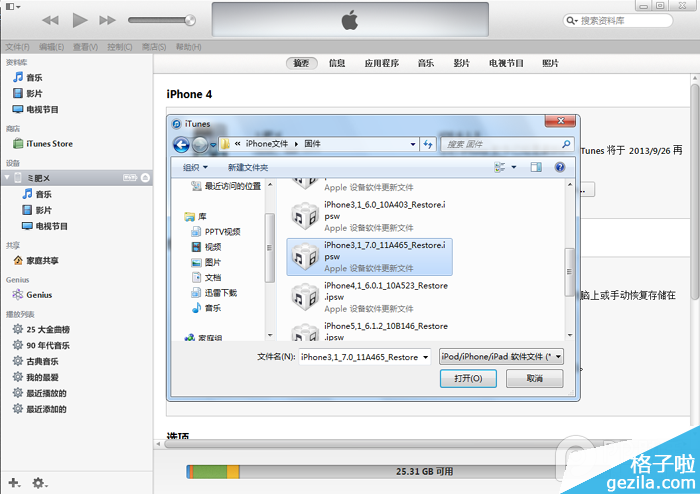 4.iTunes会弹出对话窗--请选择已经使用PP助手(Win)下载固件--点击更新--等待iTunes运行。
