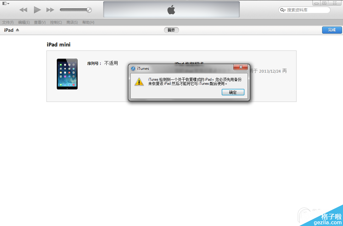 2.iTunes会自动检测到一台等待恢复的设备,点击确定: