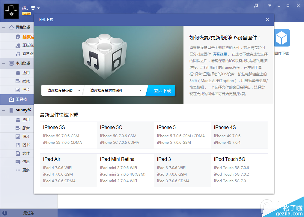 1. 使用pp助手(Win)版固件下载,下载对应手机型号最新固件版本(不建议使用iTunes直接升级,因为会使用iTunes下载固件速度非常慢)