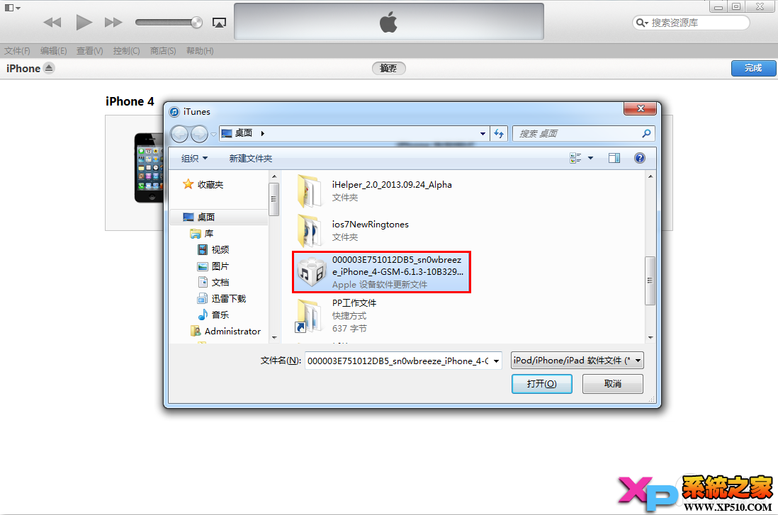 八、打开iTunes,按键盘Shift+鼠标左键点击【恢复】选择【sn0wbreeze 雪花】降级工具制作降级固件。