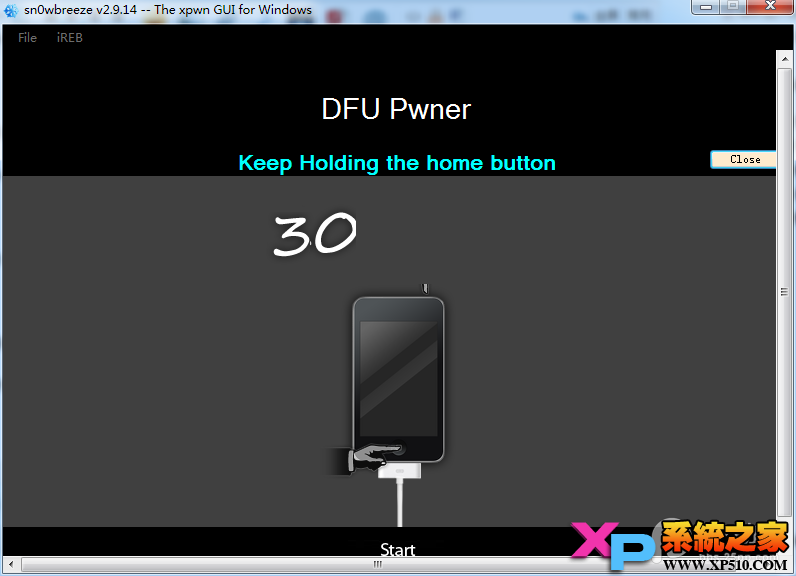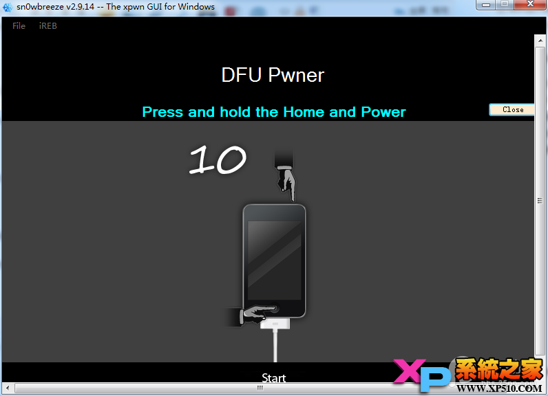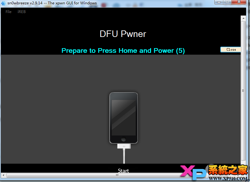先将iOS设备关机后点击【sn0wbreeze 雪花】降级工具的【Start】按钮,然后按照提示步骤操作: