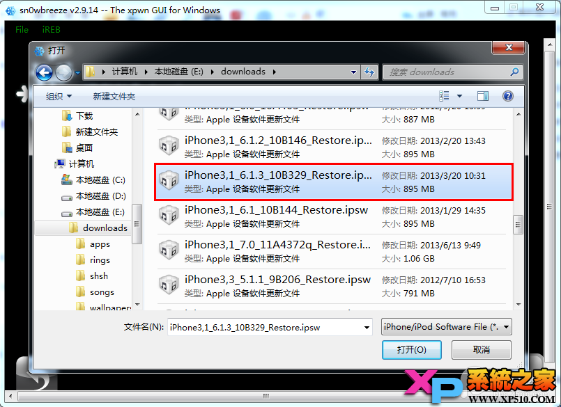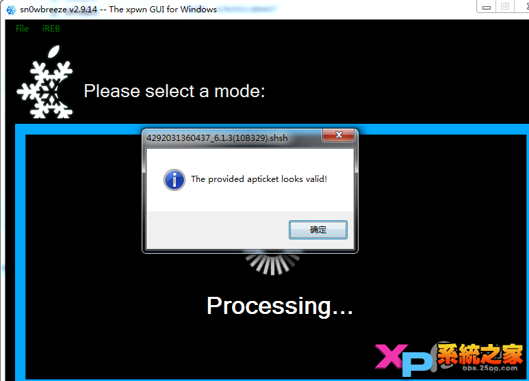 注意:【sn0wbreeze 雪花】降级工具会跟据添加固件与SHSH进行适配,请确定提示:已选择可用SHSH(证书)!