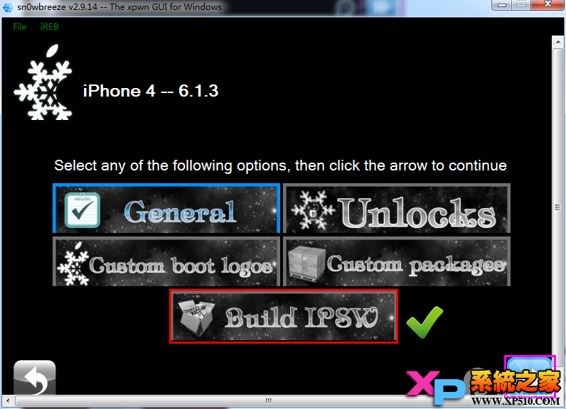 四、选择【Build IPSW】--点击下一步--【sn0wbreeze 雪花】降级工具开始制造的降级固件