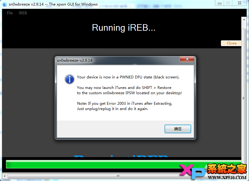 七、【sn0wbreeze 雪花】降级工具成功引导进入DFU模式--点击确认。