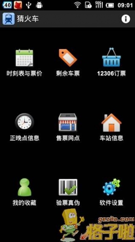 猜火车提供火车信息查询服务,与铁道部官网同步,支持最新数据!包括火车余票,售票点,时刻表,停靠车站,票价、正晚点等各种火车信息查询功能。界面美观实用,支持包括CMWAP在内的所有网络,且流量少。(China Train,支持繁体界面和繁体查询)