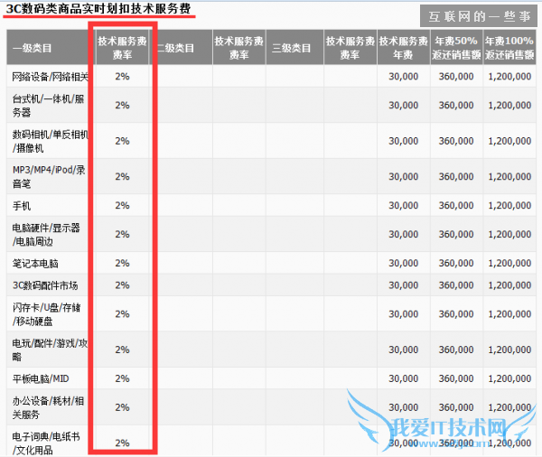 图片上是天猫向公众公布的资费标准。分析图片2的3W数码类商品收费标准,抛开起价高昂的保证金之外,每年必须向天猫上交的3万元技术服务费年费,只有当店铺销售量突破36万元甚至是120万元,才会退换年费的50%或100%。此外2%的实时划扣技术服务费,店主们称其为“天猫扣点”:店铺内任何一笔交易的成交金额的2%(不包含邮费),会自动划扣给天猫。整个天猫的收费体系,可以说构成了阿里公司营收的半壁江山。
