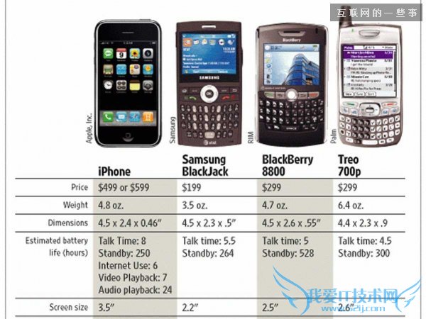 图中所展示的是同时期其他品牌手机的对比信息。iPhone的“贵”是一脉相承的,499、599刀的售价简直是令人陶醉,是其他产品售价的2-3倍之多。屏幕变大了、只有一个实体按键、电池续航大幅提升也是第一代产品带来的巨大惊喜。