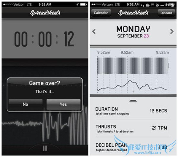 这是性爱应用里最工具化的一款。因为它会记录下用户的性爱生活频率和时长。把手机放在床上,打开Spreadsheets应用,借助手机内置的传感器来采集用户的“运动”频率、声音、时间,以此生成统计图表。用户可以很方便地看到,每一次的性生活时长、频次以及累计量等。如果打破了记录,应用也会把成绩挂在荣誉榜上。