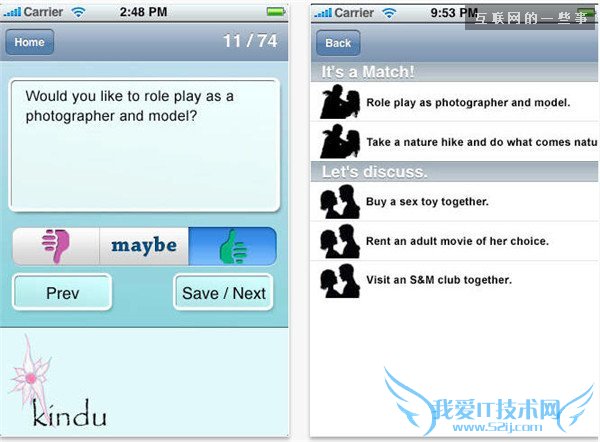 夫妻之间想要拥有完美的性生活,需要更多的沟通和交流。Kindu的作用就在于让那些两人不太好沟通的话题借助应用来解决。应用中涉及600个性生活内容选择,比如角色扮演、性爱玩具、不同的体位,像“咱们需要买一个性爱玩具”吗?夫妻双方可以在“不愿意、可能、愿意”三个选择中做出自己的回复,以此来判断大家的需求。