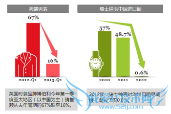 同时,由于越来越大的公众压力和反腐败工作,时尚名牌腕表也造成了很多政府官员的垮台。调查显示,从2012年第一季度到2013年第一节度英国高端服装品牌Burberry在亚太地区(主要是中国)的销售额从67%降至16%。瑞士手表的进口量的增长也降得匪夷所思(如下图)。