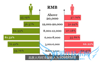 不同的收入水平影响“屌丝”自我认同的程度。事实上,调查显示,可支配收入在6001-8000元的男子和收入在3001 -6000元人民币的女子常将自己定位为“屌丝”。而北京市居民人均可支配收入为3039元人民币,表明大部分自认为是“屌丝”的人实际上的收入都高于社会平均水平(如上图)。此外,他们不需要兼顾车或房子。