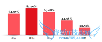 自称“屌丝”的人从60后到90后不等,其中标识性最强的是在80后的年轻人,占据到80%以上,其次是70后,再次是90后(如上图)。