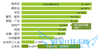 据相关调查显示(如上图),程序员和媒体行业的人自称“屌丝”的百分比最高,学生也占据了较高的比例,食品、服务行业以及市场广告行业等多自称“屌丝”,而只有少于10%的公务员自称“屌丝”。