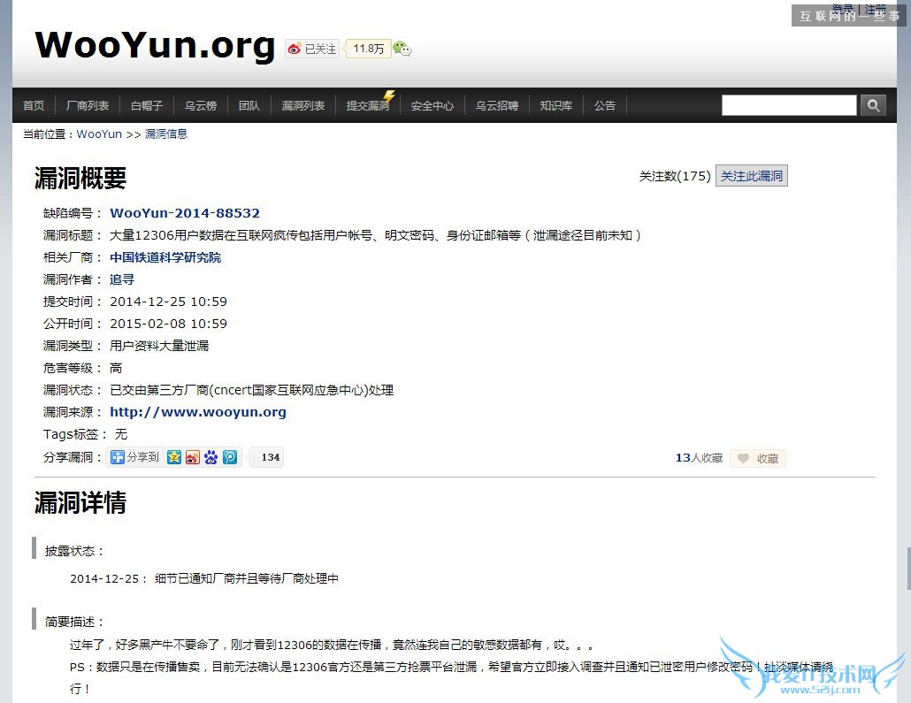 ¾ÝÎÚÔÆÂ©¶´Æ½Ì¨£¬´óÁ¿12306Óû§Êý¾ÝÔÚ»¥ÁªÍøÉÏ´«²¥ÊÛÂô£¬°üÀ¨Óû§Õ˺š¢Ã÷ÎÄÃÜÂë¡¢Éí·ÝÖ¤¡¢ÓÊÏäµÈ¡£Ä¿Ç°ÒÑÖª¹«¿ª´«²¥µÄÊý¾Ý¿âÉæ¼°Óû§ÊýÔ¼14Íò£¬Éв»Çå³þÊÇ·ñÓиü¶àÓû§Êý¾Ýй¶¡£