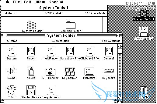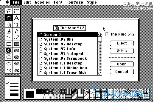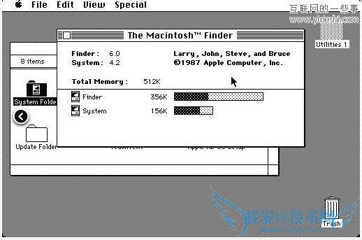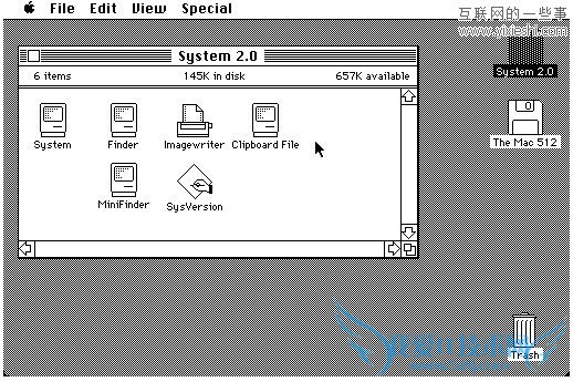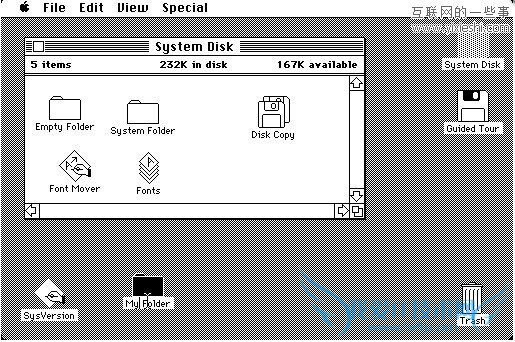 System 1.0的功能相对简单,当时并不能从菜单中建立新的文件夹。后来苹果发布了OS 1.1对1.0存在的问题进行了修复同时更新了一些软件。