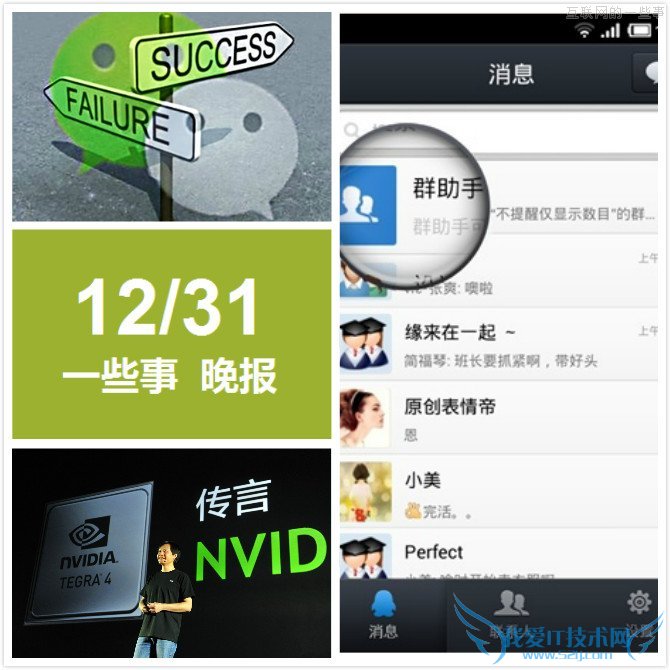 12月31日 一些事 晚报 | 汇总今日最热资讯 :张小龙莫慌 马化腾莫急 你们要好好的 微信还有时间 | 颠覆传统企业就两招:要么有用户,要么免费 | 2014年互联网金融八大猜想 | 诱惑用户,让你的设计对用户更具有吸引力!】 | 2013年互联网十大滥用 | 2013年搜索引擎大盘点,痛苦和爱交织 | 豆瓣:慢公司成长逻辑 | 2013年中国八大供应链创新案例 | 2013电商:马云退休 强东西游 O2O引剧变 | Android轻聊版QQ上线:只有聊天