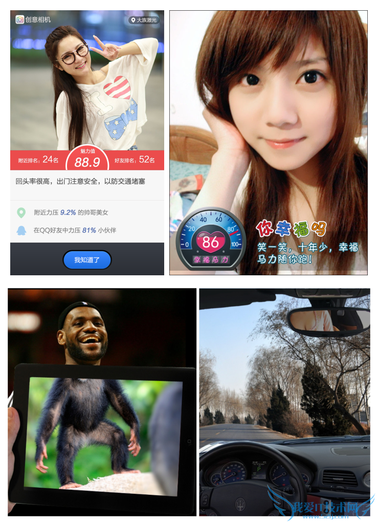 新版中,依旧保留着魅力值、幸福马达这类“高科技”模板;以魅力值为例,相机根据脸型、五官、皮肤光滑度等多个维度进行综合打分,在连网情况下,用户还能和附近用户以及QQ好友进行魅力PK,一展风姿。此外,动物身、豪车这类精彩模板同样继续在新版中,为用户带来趣味创意体验。