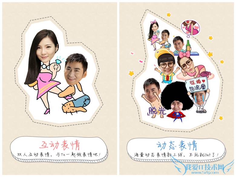 新版中,最大的创新当属双人互动表情。“土豪做朋友”、“相亲相爱”、“家暴”等8款搞笑互动模板,具有简单的剧情,让人眼前一亮;不仅可选人脸、宠物、萌宝宝等5款脸型,还能互换人脸位置,使一对表情展现出不同效果,成为朋友间相互整蛊的神器!