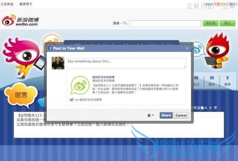 通过Facebook账号登陆的用户,直接进入了一个留言页面,其将会显示在Facebook的时间线上,以通知Facebook好友该用户正在使用新浪微博。除此之外,新浪微博台湾版的一篇文章显示,用户还能够通过新浪的图形API,是的在新浪微博上更新的状态和音视频内容也能够分享到Facebook。