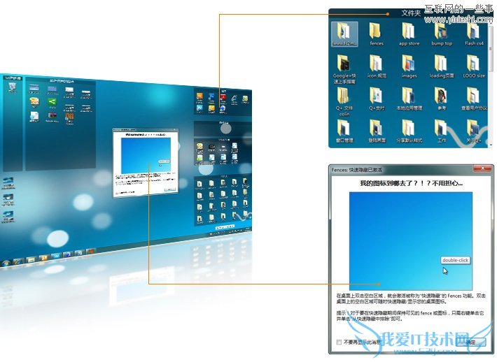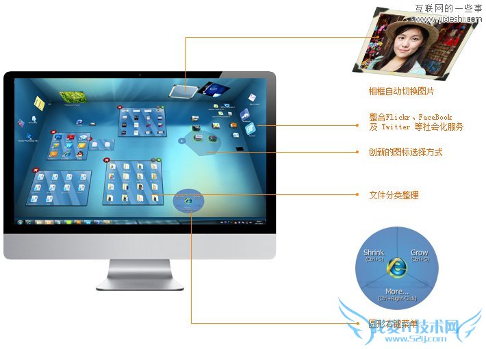 (1)最大特色:3D立体空间,设计风格偏干净简洁型,图标有变形拉伸,视觉阅读性比较差。鼠标可任意去框选图标功能和区别于微软的右键圆形菜单也算是俩个小亮点。