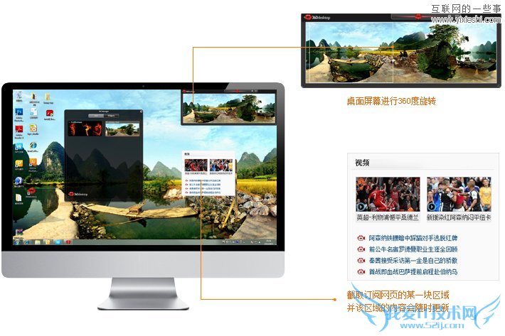 (1)最大特色:360度滚动的全景桌面 (2)订阅网页的某一块区域,并且该区域的内容会随时更新,点击相应标题即可打开链接浏览网页内容。