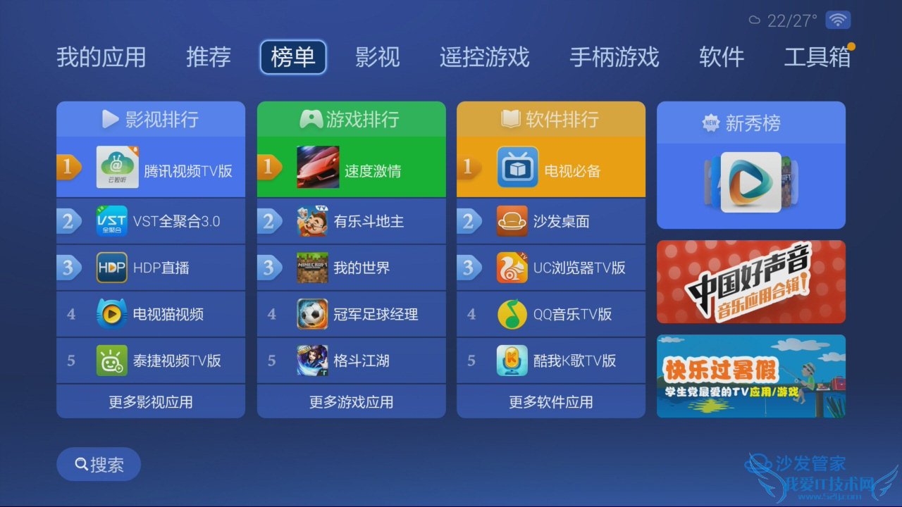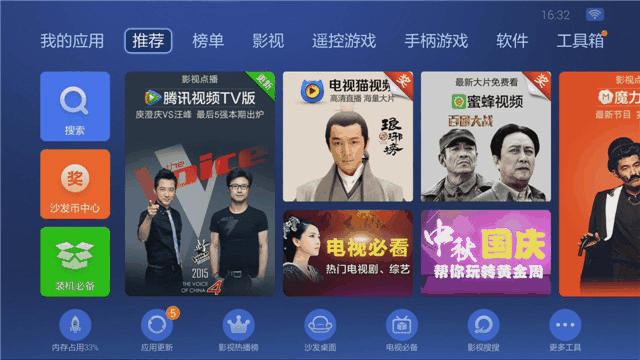 沙发管家安装好后,即可直接在电视上快捷安装各类视频、音乐、游戏、早教等应用,沙发管家→推荐→电视必备有很多常用应用,如直播可以用HDP ,点播用布丁视频 。
