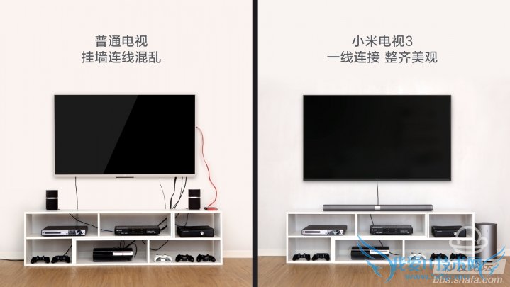 对比一下,可以非常明显得看出分体电视的亮点。为了这一点点的整洁,我们付出了非常艰辛的努力。