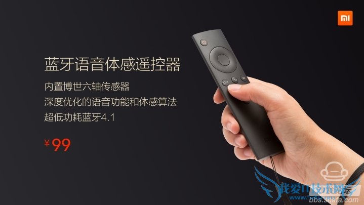 还可以全新升级的小米语音体感遥控器,内置博世六轴传感器,深度优化语音功能和体感算法,超低功耗蓝牙4.0,仅99元。