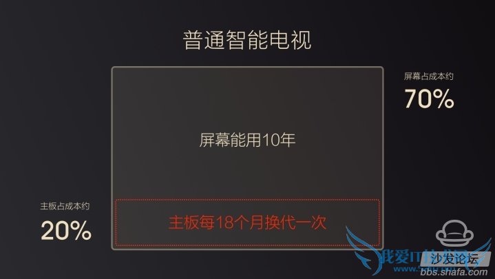 电视的屏幕和主机分开之后,主机和屏幕都可以单独升级。使得整个电视永远不会落伍。