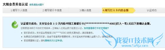 支付宝公司,在1-2天之间,会给你的银行卡打入一笔钱,其金额肯定在1元以下但不能确定具体是多少,如果给你银行打款成功,支付宝会给你手机发短信通知你,让你登陆你的网银查看,登陆网银后,点击查看账户明细,选择日期-往前推两天!其中,你会发现有一笔收入金额,在1元以下的,备注是支付宝,记住金额(如:0.12 、0.36 等等)然后登陆淘宝网,同样点击卖家中心、免费开店、开店认证、开通实名认证(注意,此时会出现让你输入打款金额,将支付宝给你的打款金额,正确的输入到框框里面,点击提交确认,如果你输入的金额正确,网银认证就通过啦!