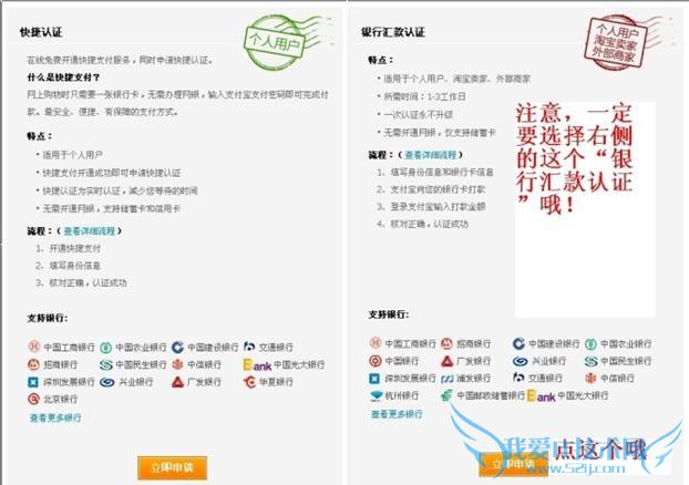 点“立即申请”后,一定要注意使用右边的【银行汇款认证】哦,这个是专门针对个人用户、淘宝卖家和外部商家的通道。