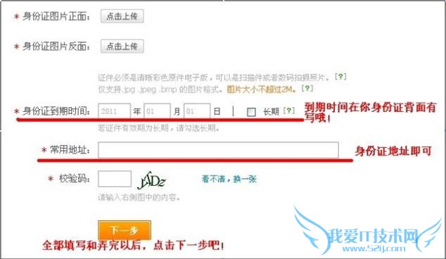 点击立即申请后,将会出现填写个人信息,争取填写你的真实姓名、身份证号码、联系方式、身份证类型,然后点击上传你的身份证正反面,最后填写身份证到期时间和常用地址,填写验证码之后,点击进行“下一步”;