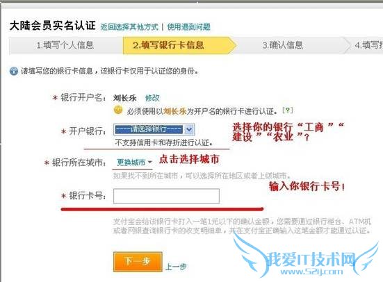 点击进行下一步后,会进入填写银行卡信息,在开户银行下拉框中选择你的开户银行,银行所在城市、银行卡号等信息,直接进入下一步操作;