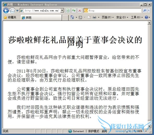 9月1日,莎啦啦网站关闭,暂停营业。莎啦啦董事会当天发表声明,揭示了这场“惊秫剧”的原委:8月30日,莎啦啦控股股东智基创投宣布董事会决议,停止田园的总经理职务;原总经理田园拒不执行董事会决议,强行扣留公司所有证照和印章,并对董事会成员进行野蛮驱逐,致使公司日常经营活动无法进行。