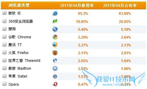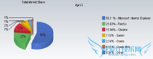 全球各浏览器的市场份额变化甚微。其中IE浏览器和firefox相比3月份分别下降了0.81%和0.17%,而chrome则上升了0.37%。而其他的浏览器基本上没什么变化。
