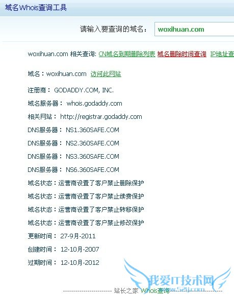 查询Whois信息得知,woxihuan.com域名注册于2007年,有4年注册时间,目前域名DNS服务器上显示系360公司的360SAFE.COM,但域名所有者显示系北京世界星辉公司(Beijing Star World Technology Co., Ltd.)。