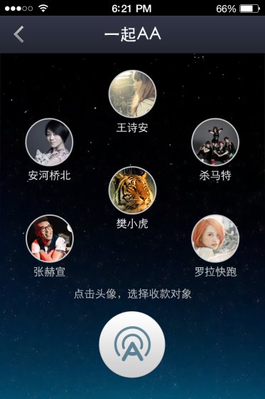 “一起AA”功能适用于聚餐这样的线下场景。例如,如果五个人在一起AA制聚餐,当其中一人埋单之后,他就可以用支付宝钱包来向其他几位伙伴收取餐费。截图显示,“一起AA”通过声波技术搜索使用者附近的人,然后收款人可点击将需要AA的对象列入收款范围,双方再通过声波完成支付。