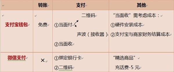 支付宝的运营方式包括"当面付"和"当面收"两种。"当面付"可通过二维码和声波支付,从用户的角度来说,这是一个改变付款习惯的支付方式,用户在线下购物不用带现金,就能买单;而从商家的角度来说,"当面收"会增加两个成本:一是硬件的安装成本,另一个就是支付宝钱包与商家的财务结算成本。目前,支付宝"当面付"声波接收器的价格是50元左右,未来这一价格还会再往下降。这对商家或者支付宝来说,硬件成本较低,并不会因为硬件成本而放弃。至于后者,用户在商家使用"当面付"时,产生的消费划入卖家的支付宝账号进行结算,而用户端不必支付结算费用。