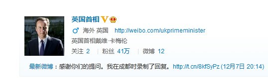 在卡梅伦结束访华回到英国后,开通了一周的“英国首相”卡梅伦的微博粉丝周六(12月7日)已经超过41万人。