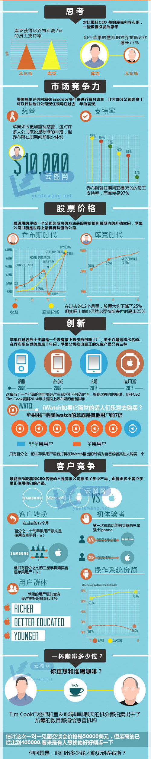 在乔布斯走后的两年,苹果混的怎么样?业界很多专家预测的是苹果在没有乔布斯作为导向的情况下将失去发展方向。这张汉化信息图给我们带来了从新旧领导人的员工支持率,苹果的盈利增长,股票价格,市场竞争力,创新等几个方面考察了库克是否真的不如乔布斯。