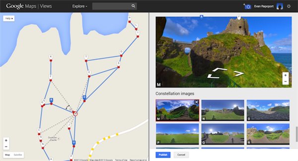 然后,用户可以简单地将这些照片拼接成一幅地图,如在上面的图形所示。现在,游客到谷歌地图中通过你的眼睛观看世界了。除了能够拍摄谷歌街景覆盖不了的地区照片之外,Views也可以让人们记录特定地区不同的天气条件下或文化活动。
