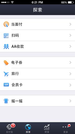 具体来看,“探索”囊括的是主打线下支付的“当面付”、“一起AA”功能。此外,正在努力渗透线下的支付宝钱包还在这一版块中增加了会员卡功能,配合原有的商家公众账号为商家增强会员维护的功能。