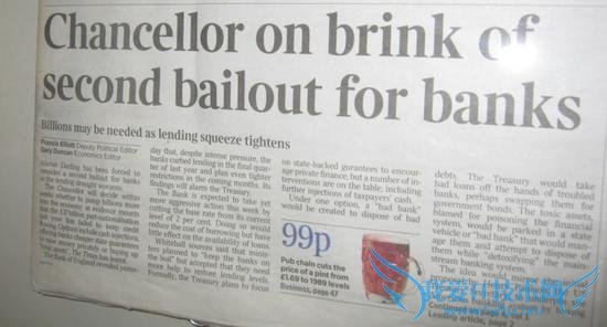 2009年1月3日,《泰晤士报》的头条刊登着“大臣走在了第二轮银行业救助的边缘”一文,讨论了英国财政大臣Alistair Darling不得不考虑进行第二轮银行援助,以缓解贷款资源紧缺的状况。