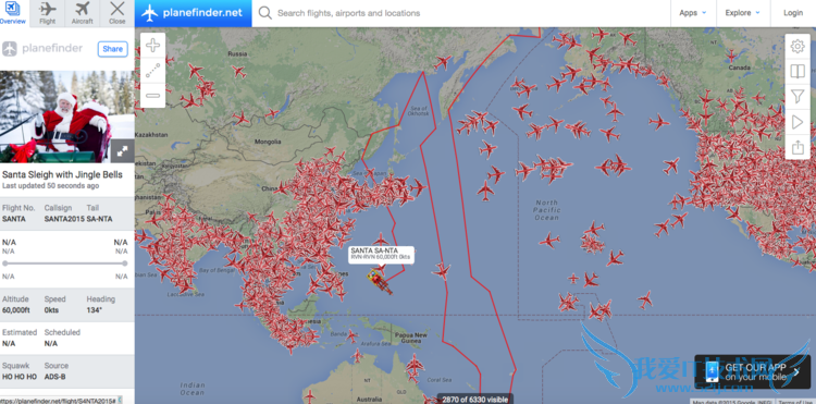 接下来,就让我们看看,一年只有一次的圣诞老公公飞行航班,如何通过 Google、Plane Finder、北美防空司令部(Norad)等的网页上,来追踪他的去向。