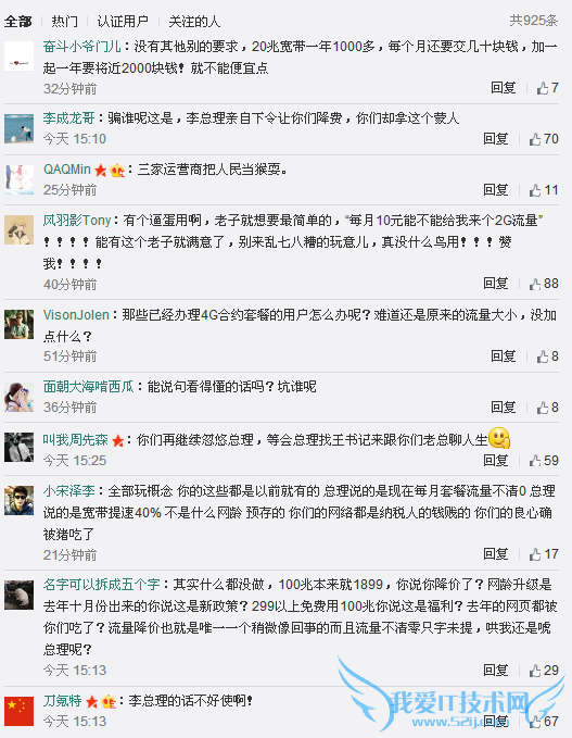 欢迎您访问我爱IT技术网,今天小编为你分享的是新闻资讯是:【三大运营商新政遭网友吐槽 被指毫无诚意应付总理糊弄消费者】,下面是详细的分享!